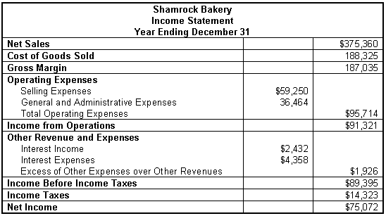 The table below shows the income statement for the Shamrock Bakery for the year ending December 31.