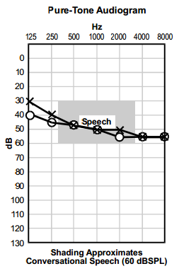 This question requires the examinee to understand how to interpret results of formal and informal assessments of audition (e.g., audiograms). On a pure-tone audiogram, X represents the left ear and O represents the right ear; sounds below the lines can be heard. In the audiogram shown, although the individual's hearing is within the range of conversational speech, it is close to the bottom of that range. The results indicate that while low and/or loud speech sounds may be audible to the individual, high and/or soft speech sounds may be inaudible. A hearing loss at this level is typically categorized as a moderate loss.