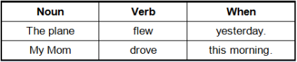 This question requires the examinee to demonstrate knowledge of first- and second-language teaching strategies appropriate to the needs of children and youth who are deaf or hard of hearing. The teacher of the deaf/hard of hearing has provided Chris with a visual illustration of the word order in a standard English sentence: first a noun (e.g., "The plane"), then a verb (e.g., "flew"), then a modifier that tells how or when (e.g., "yesterday"). The table would therefore be especially helpful for developing Chris's knowledge of basic sentence structures used in English.