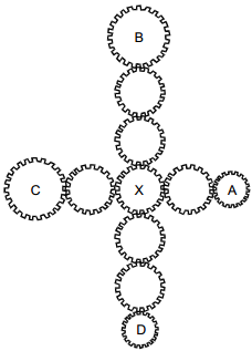 Gears that are in direct contact with each other turn in opposite directions. Therefore, gears that are in a straight line and separated by an odd number of intervening gears will turn in the same direction. Gears A and C will turn in the same direction as gear X. A larger gear in contact with a smaller gear will turn more slowly than the smaller gear. The gears in contact with gear X have the same diameter as gear X and will therefore turn at the same speed as gear X. Gear C is larger than these intermediary gears and will therefore turn more slowly than they will, and thus more slowly than gear X.