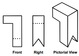 The top view of the object in the diagram must correctly indicate the location of the groove in the bottom of the object and the 90-degree angle or bend in the object. In answer choice A, the dashed lines used to represent hidden lines represent both of these features geometrically centered.