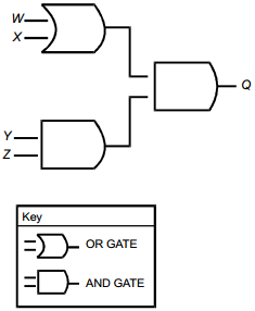 Logical AND gates produce a logical 1 only when each of their inputs is 1. For output Q to have a value of 1, the AND gate immediately preceding it must have an input of 1 at each of its inputs. This means that the lower left AND gate must also have an input of 1 at each of its inputs, which are labeled Y and Z. Answer choices A and D satisfy this condition. For the upper left OR gate to generate a logical 1, at least one of its inputs must be a logical 1. This restriction eliminates answer choice A as a possible solution. Answer choice D, in which W = 0, X = 1, Y = 1, and Z = 1, satisfies the conditions.
