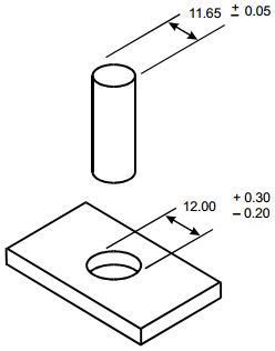 The range of clearances for the machined parts is found by determining the differences between the maximum and minimum dimensions of each. The rod has a maximum size of 11.65 + 0.05 = 11.70. It has a minimum size of 11.65 – 0.05 = 11.60. The hole has a maximum diameter of 12.00 + 0.30 = 12.30. It has a minimum diameter of 12.00 – 0.20 = 11.80. The smallest clearance is 11.80 – 11.70 = 0.10. The largest clearance is 12.30 – 11.60 = 0.70.